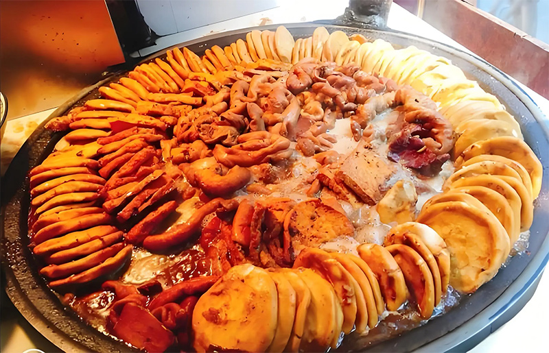 卤煮是北京一道著名的地方传统小吃,它是将炖好的猪肠和猪肺放在一起煮,搭配火烧一起食用。卤煮起源于北京城南的南横街。据说光绪年间,因为用五花肉煮制的苏造肉价格昂贵,所以人们就用猪头肉和猪下水代替。经过民间烹饪高手的传播,久而久之,造就了卤煮火烧。