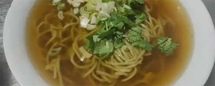 5、用勺子舀一勺面汤加入之前兑好的汤料碗中,放入捞出的抿曲,撒葱花、香菜即可。