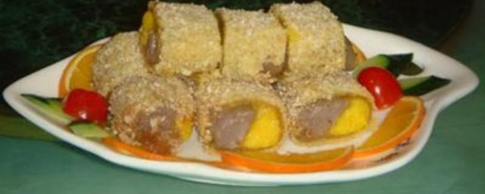 将黄白色的段各取一条合拢,捏成三角条形,两头向上扭成螺旋形圆饼,按扁,包入馅,入温猪油锅内炸制,酥饼黄、白两边各安上蜜樱桃一颗即成。Fun