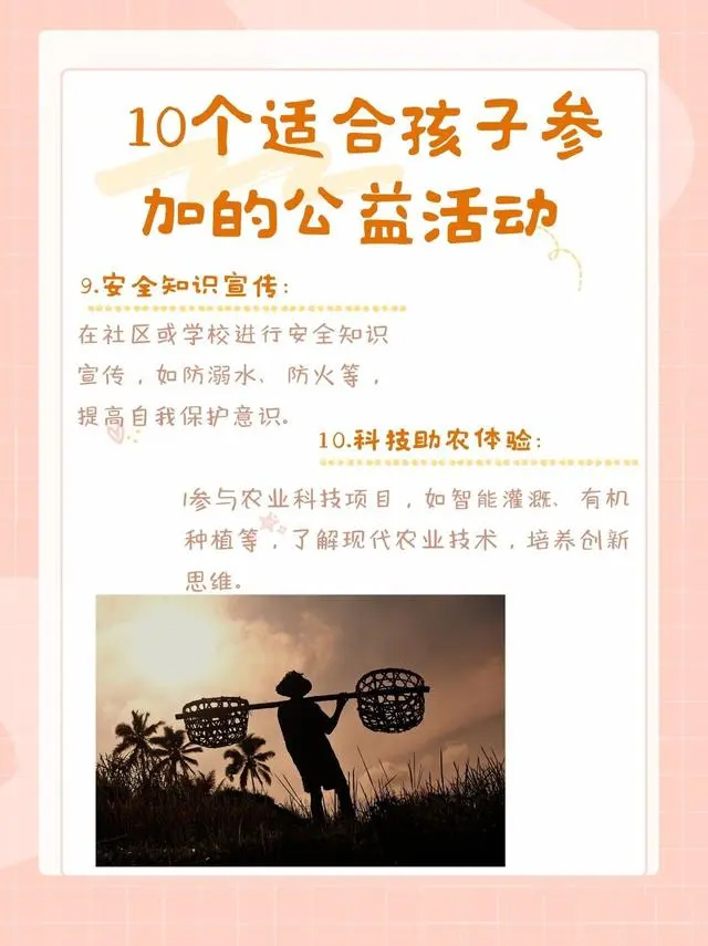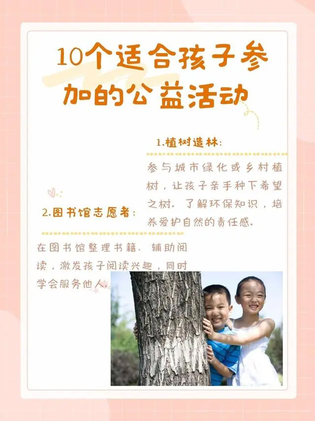 1.植树造林:参与城市绿化或乡村植树,让孩子亲手种下希望之树。了解环保知识,培养爱护自然的责任感。2.图书馆志愿者:在图书馆整理书籍、辅助阅读,激发孩子阅读兴趣,同时学会服务他人。