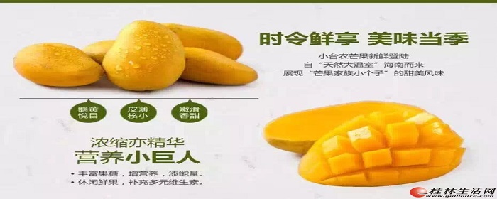 贵妃芒:果皮青里透红,成熟时呈黄色带彩色,核小无纤维,水分充足,芳香浓郁。