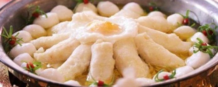 | 白汤肥鱼采用当地盛产的肥鱼和肥膘肉一起蒸制而成,肥鱼无鳞少刺,鱼肉鲜嫩,熬制出的鱼汤呈奶白色,味道鲜美浓稠,十分美味。 | |