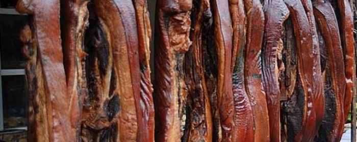 | 青城老腊肉产自四川都江堰青城山,以当地猪肉为原料,经腌制、熏烤等工序制成。色泽红亮,肉质紧实,口感咸香,有独特烟熏味,是当地特色美食。 | |