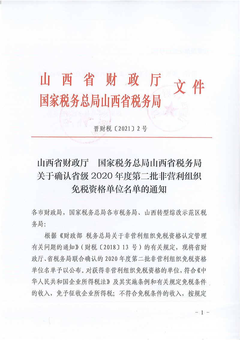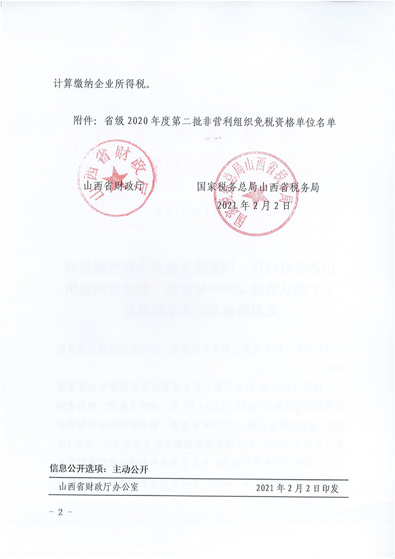 山西省财政厅 国家税务总局山西省税务局关于确认省级 2020 年度第二批非营利组织免税资格单位名单的通知