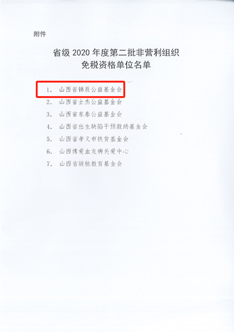山西省2020年度第二批非营利组织免税资格单位名单(灯塔基金会排第1位)