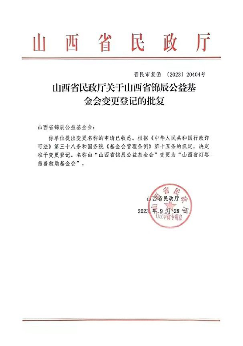 山西省锦辰公益基金会于2023年09月28日更名为:山西省灯塔慈善救助基金会