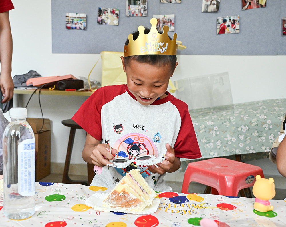 生日会上,孩子们围坐在一起,在热烈掌声与欢声笑语中许下心愿,共同唱响生日歌,分享美味蛋糕。最令人动容的是关爱包发放环节,未保中心工作人员与项目组志愿者弯着腰或蹲下来身子,将关爱包郑重交到孩子们手中,轻声询问学习与生活近况。有的孩子紧紧抱着关爱包,有的迫不及待拆开,翻看里面的礼物,还有的主动与同伴分享喜悦。现场的相机快门声、欢笑声交织,定格下无数温暖瞬间。