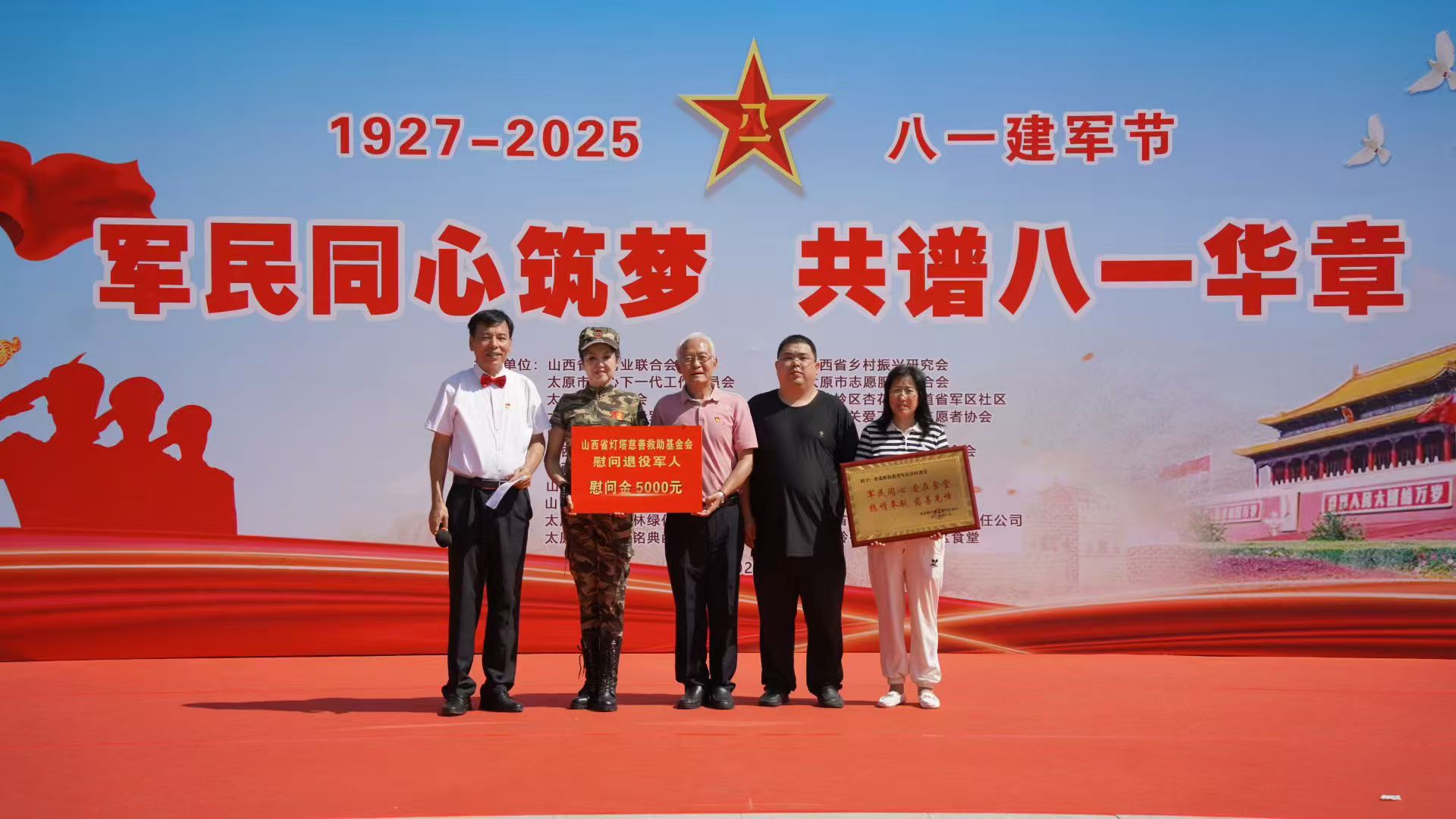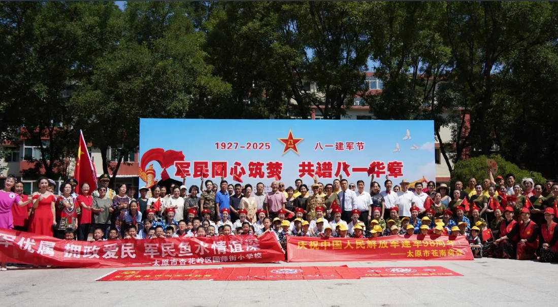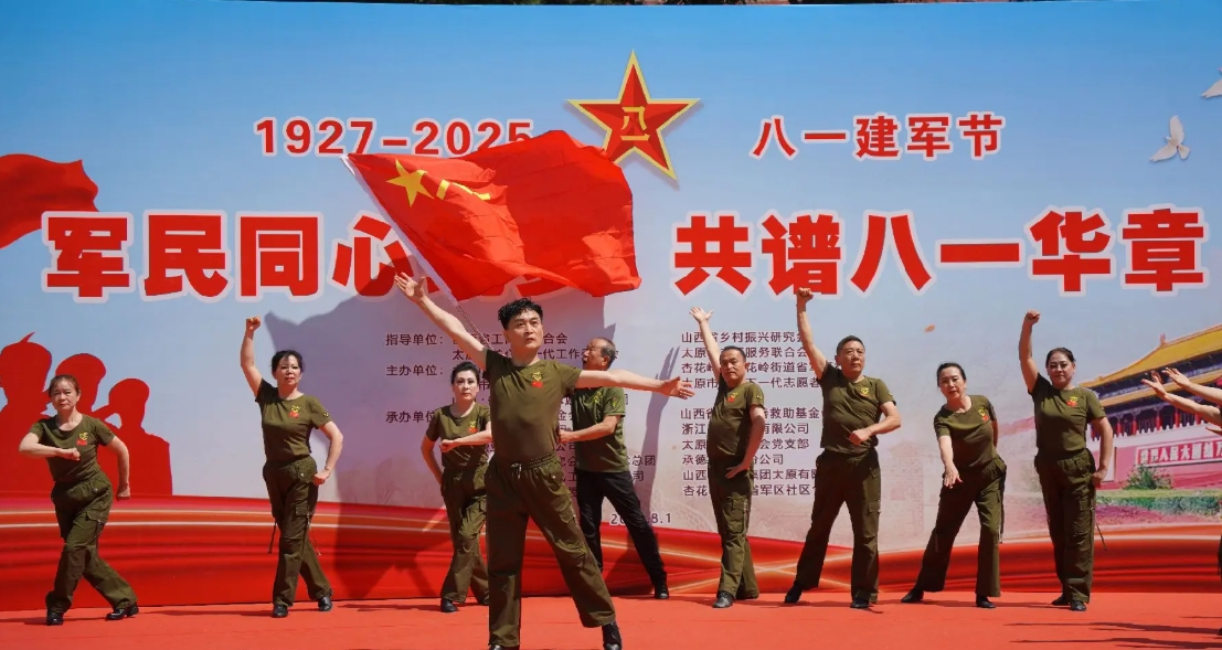 2025年7月30日上午,在山西省军区社区文化广场举行“庆八一”慰问演出。由山西省城学雷锋志愿服务总团、太原市关心下一代工作委员会、太原市志愿服务联合会、杏花岭街道省军区社区、山西省灯塔慈善救助基金会等21家单位联合举办的“军民同心筑梦 共谱八一华章”庆祝中国人民解放军诞辰98周年暨抗战胜利80周年活动在山西省军区社区文化广场举行。一首首军旅歌曲化作一股股暖流,淌进老兵的心田,成为向老兵致敬的温暖行动。