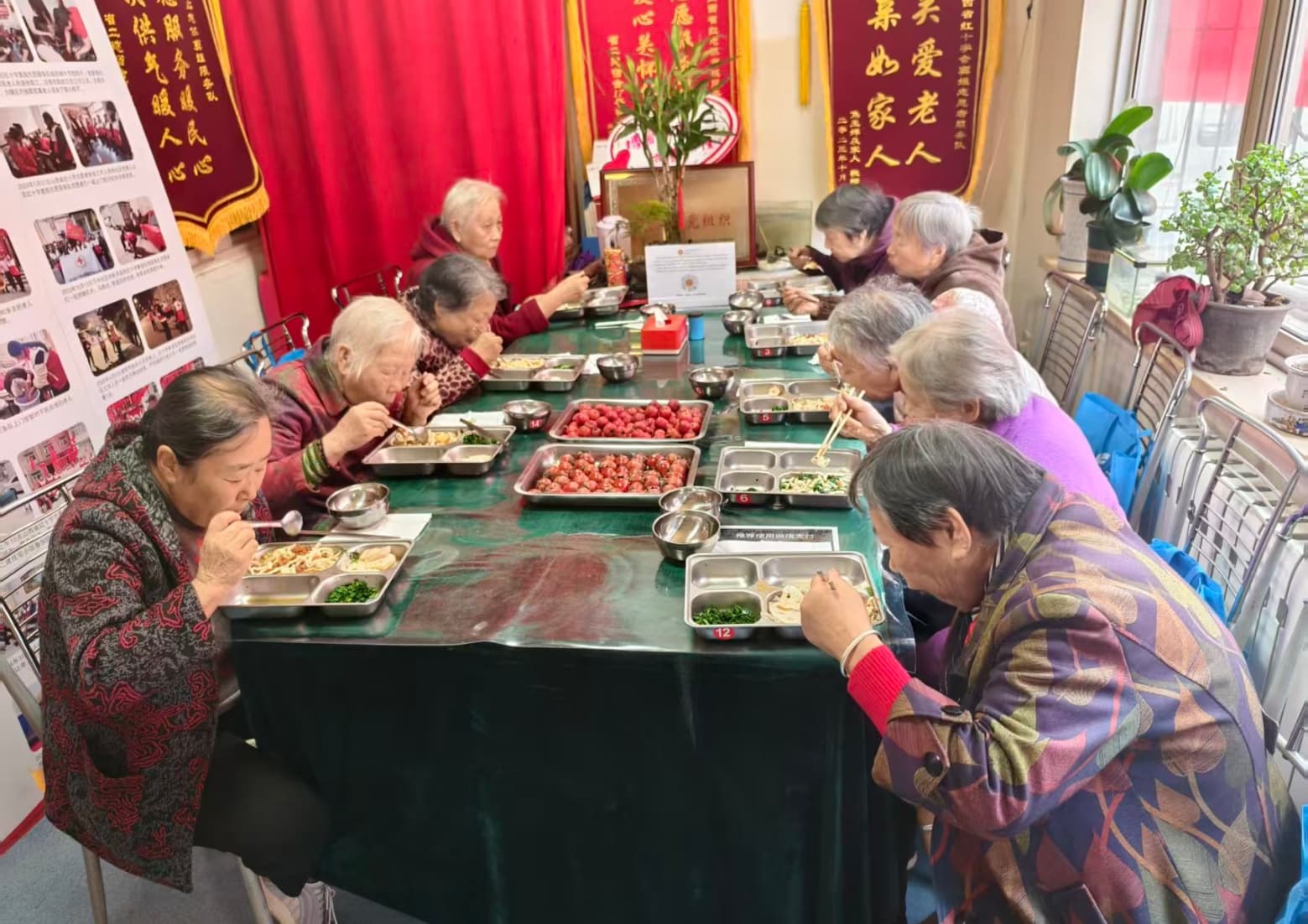 为了让老人们在寒冷季节也能通过午餐补充营养,食堂团队严格遵循“一荤一素一汤一主食”的标准准备爱心午餐,还根据初冬养生需求调整了菜品结构。炖得软烂入味的红烧肉、清爽解腻的蒜蓉西兰花、暖胃驱寒的玉米排骨汤,搭配香软的米饭或馒头,每天的午餐菜品各不相同,既保证了营养均衡,又兼顾了老年人口味偏淡、咀嚼不便的特点。有老人笑着说:“这午餐比家里做的还贴心,一口热汤下肚,浑身都暖和了。”